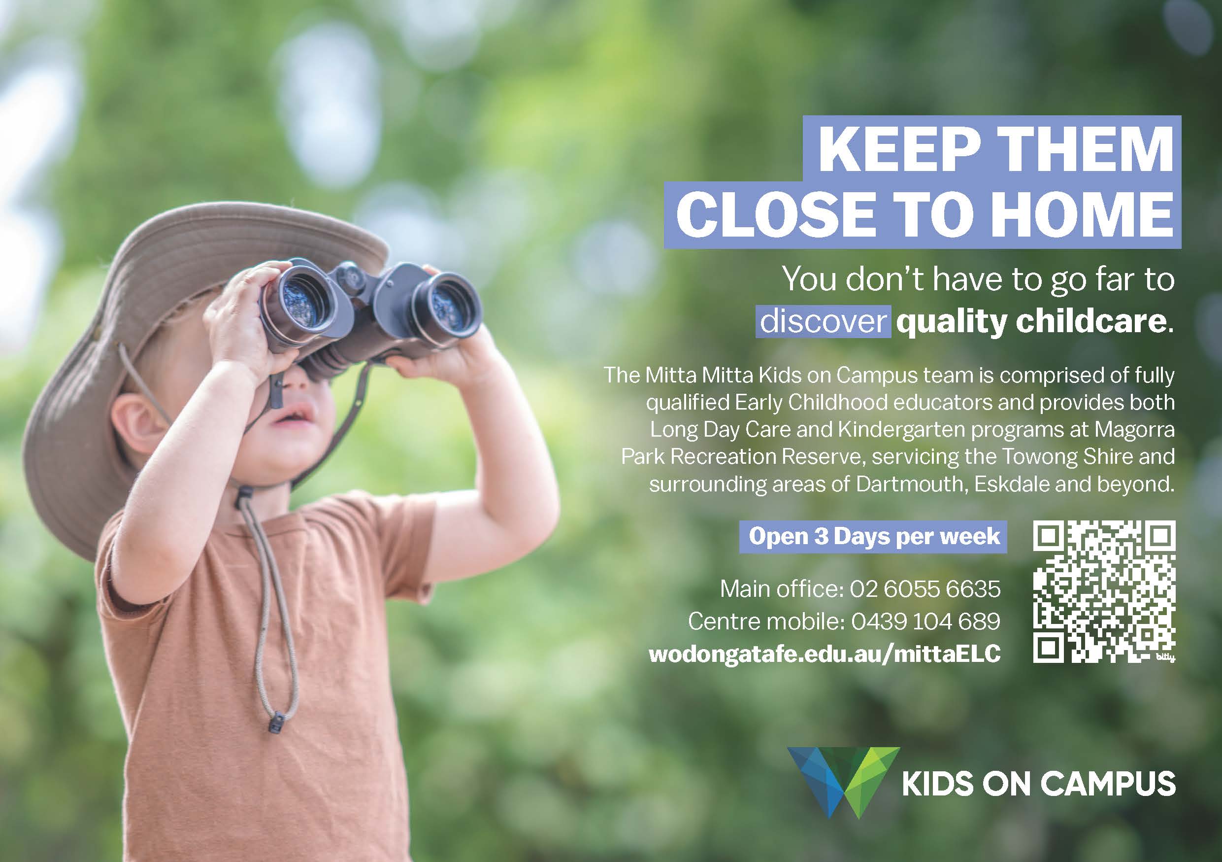 The Mitta Mitta Kids on Campus team is comprised of fully qualified Early Childhood educators, and provides both Long Day Care and Kindergarten programs. Located at Magorra Park Recreation Reserve, this centre services the Towong Shire and surrounding areas of Dartmouth, Eskdale and beyond.